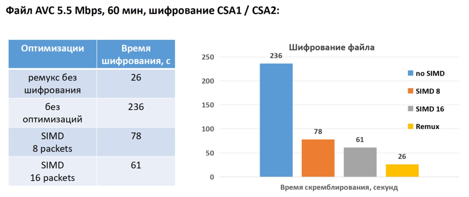 - Выборочное шифрование. Например, шифруется только один TS-пакет из 16. Такой режим существенно снижает вычислительные затраты как на шифрование, так и на дешифрование, что особенно важно для совместимости со старым парком относительно маломощных STB, но при этом обеспечивает достаточную деградацию качества декодированного без ключа изображения.