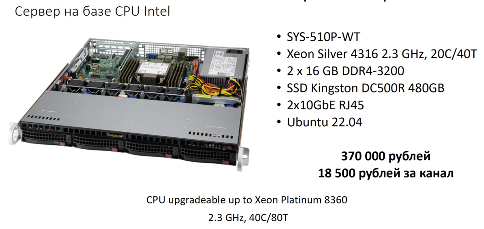 В практическом смысле это означает, что для организации сплошного скремблирования 20 MPTS со средним битрейтом 100 Мбит/с каждый нам понадобится весьма скромный сервер на базе 1 ЦПУ Xeon Silver 4316 (2.3 GHz, 20C/40T):
