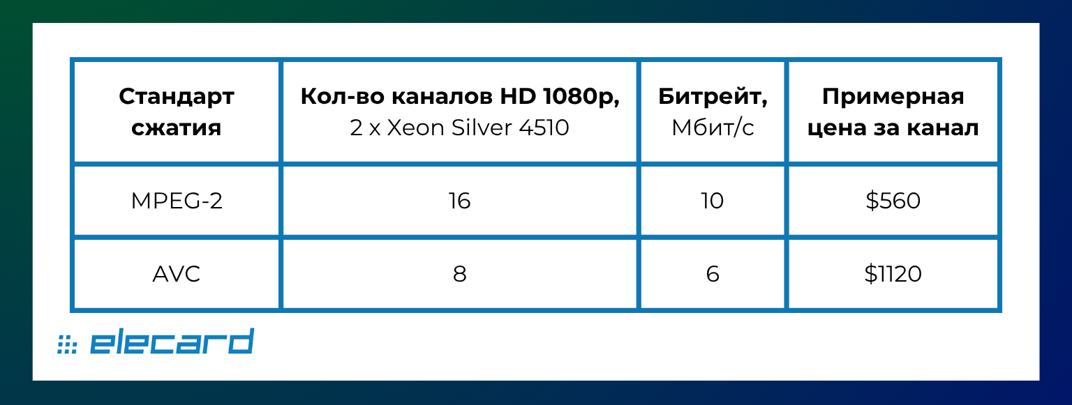 Процессорное кодирование позволяет гибко подходить к выбору платформы. Можно подобрать платформу и на 4 ядра и на 128 ядер, соответственно на 1 или 32 канала кодирования. В качестве примера возьмём приблизительный расчёт стоимости кодирования на процессоре Intel Xeon Silver 4510. Цена за сервер Supermicro с 2 процессорами с необходимым объёмом памяти и прочим в РФ будет стоить около $9000. При расчёте на 16 или 8 каналов: