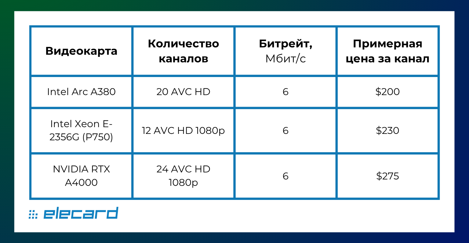 Использование видеокарт значительно снижает стоимость кодирования, но имеет некоторые аппаратные ограничения параметров кодирования (например, кодирование на большинстве доступных карт Nvidia не поддерживает интерлейсинг). Так, кодирование на Intel Arc A380 очень доступно и по цене, и по логистике (A380 можно купить даже в магазинах потребительской техники).