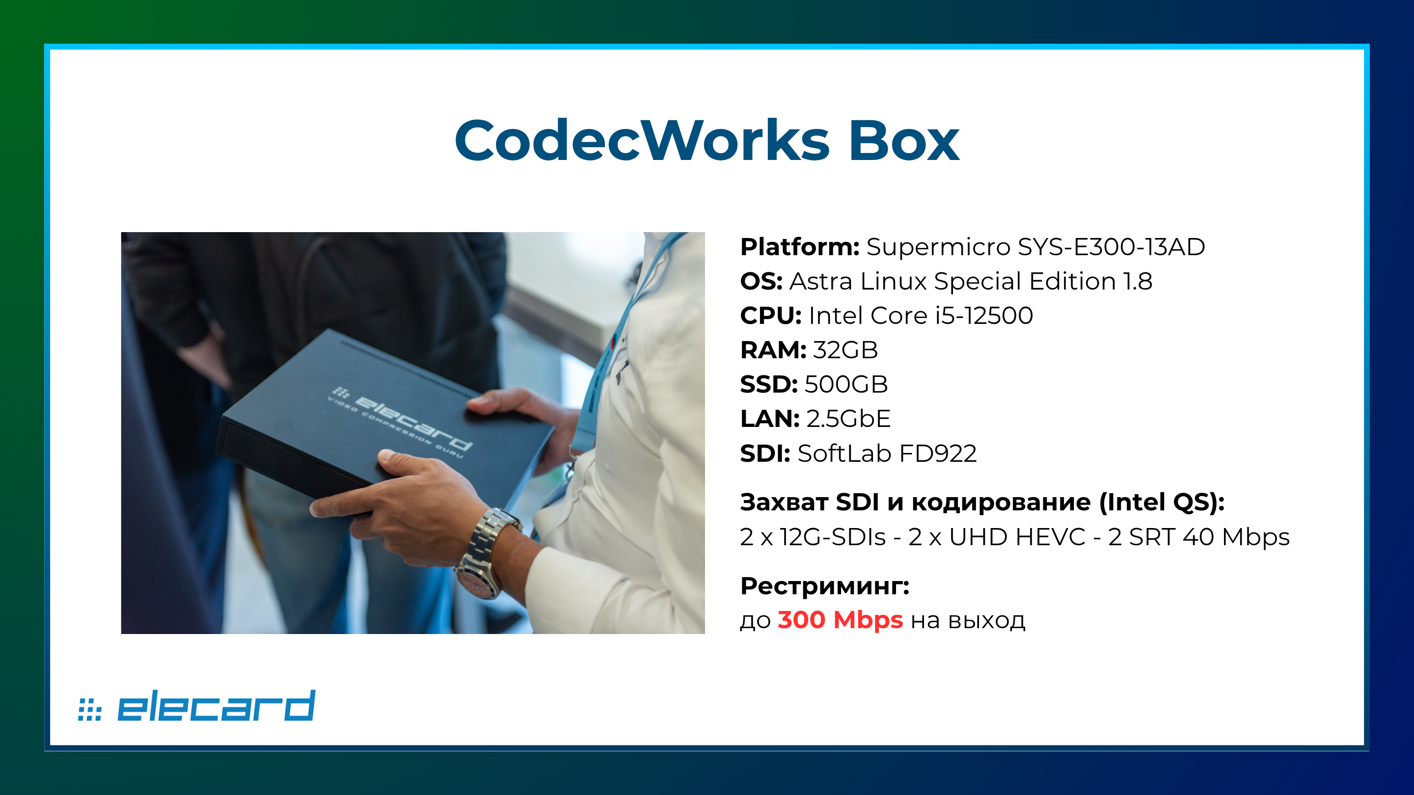 Если вы ищете надёжное и готовое к использованию решение для кодирования на GPU, рекомендуем обратить внимание на CodecWorks Box. Его характеристики приведены ниже: