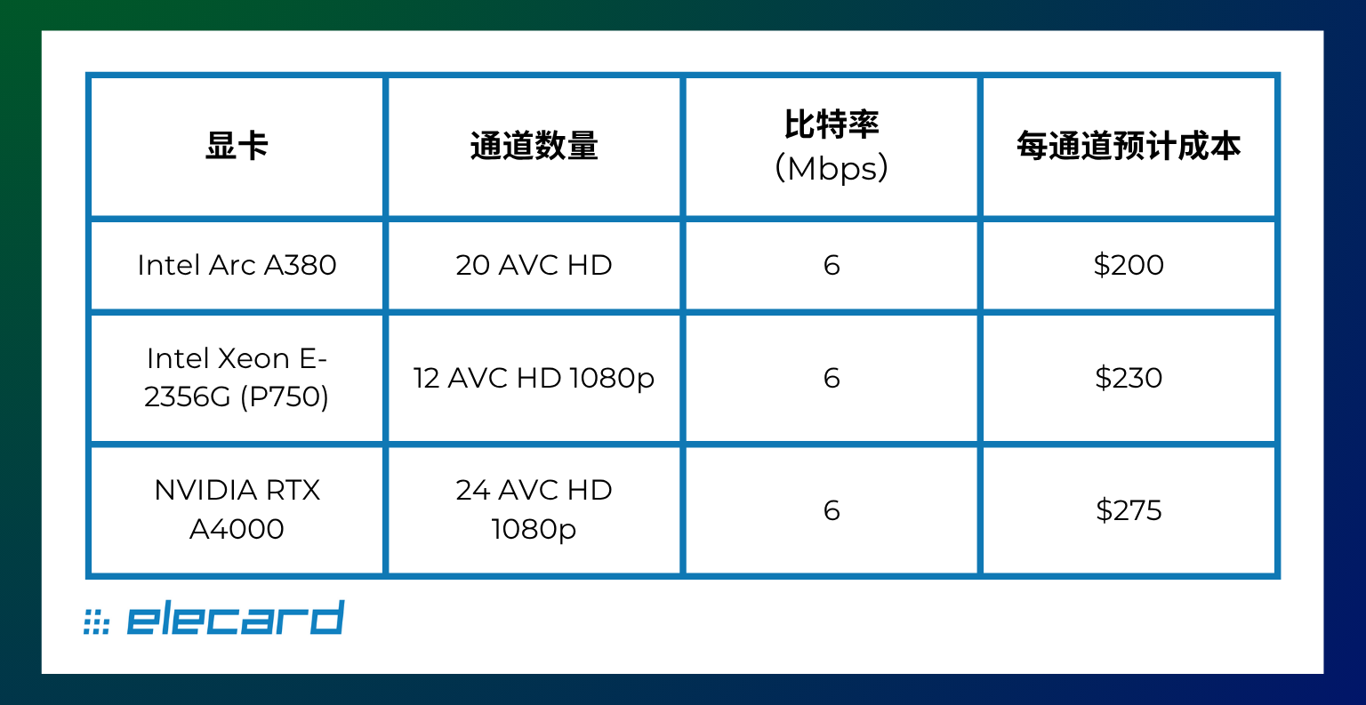 例如,Intel Arc A380显卡的编码方案价格低廉,且在市场上容易获取(甚至可以在消费级电子产品商店购买)。